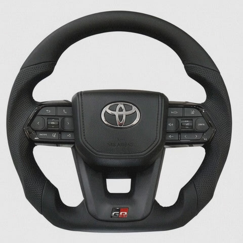 Transform your cabin with a steering wheel that pairs real carbon fibre with premium perforated leather—engineered for drivers who want sharper feedback and a bold GR aesthetic. The flat-bottom profile improves leg clearance and control, while the red 12-o’clock marker and GR details bring authentic motorsport cues into daily driving. Built on OEM core mounting points, it fits precisely; a clock spring is included for compatibility. Supplied with airbags and multifunction buttons (airbag pyro detonator module not included).